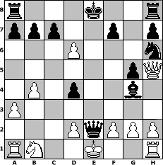 game notation in PGN-format [Event "9. Frankenwaldsturnier"] [Site "www.myChess.de"] [Date "2009.08.21"] [Round "2"] [White "bluescreenlover"] [Black "Schefsche"] [ECO "C20"] [WhitemyELO "1335"] [BlackmyELO "1363"] [Result "0-1"] [TimeControl "10/864000"] [WhiteDays "19"] [BlackDays "15"] [MyChessNo "58478"] 1. e4 e5 2. c4 Nc6 3. Nf3 Bb4 4. a3 Bc5 5. b4 Bd4 6. Nxd4 Nxd4 7. Qh5 Qf6 8. Bd3 Nh6 9. Bb2 d6 10. Bxd4 exd4 11. c5 g5 12. cxd6 Bg4 13. e5 Qxe5+ 14. Be2 Qxe2# 0-1 position notation in FEN-format r3k2r/ppp2p1p/3P3n/6pQ/1P1p2b1/P7/3PqPPP/RN2K2R - KQkq - 0 15 Captured white pieces: Captured black pieces: Click on a captured piece in order to display the desired move!