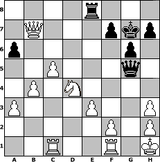 game notation in PGN-format [Event "Tigran (Wartanowitsch)Petrosjan Turnier"] [Site "www.myChess.de"] [Date "2009.08.09"] [Round "1"] [White "freizeitspieler"] [Black "Knight"] [ECO "E11"] [WhitemyELO "1562"] [BlackmyELO "1179"] [Result "1-0"] [TimeControl "10/2592000"] [WhiteDays "90"] [BlackDays "90"] [MyChessNo "58151"] 1. d4 Nf6 2. c4 e6 3. Nf3 Bb4+ 4. Bd2 Bxd2+ 5. Nbxd2 d5 6. c5 Nc6 7. a3 O-O 8. Qc2 Re8 9. b4 a6 10. e3 e5 11. dxe5 Nxe5 12. Nxe5 Rxe5 13. Nf3 Re4 14. Bd3 Re5 15. Nxe5 Qe7 16. Nf3 Bg4 17. Nd4 Ne4 18. O-O Qh4 19. Bxe4 dxe4 20. Qxe4 g6 21. Qxb7 Re8 22. Qxc7 Qg5 23. Rac1 Bh3 24. Qc6 Rc8 25. Qb7 Re8 26. Kh1 Kg7 27. gxh3 1-0 position notation in FEN-format 4r3/1Q3pkp/p5p1/2P3q1/1P1N4/P3P2P/5P1P/2R2R1K - - - 0 27 Captured white pieces: Captured black pieces: Click on a captured piece in order to display the desired move!