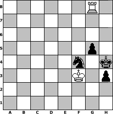 game notation in PGN-format [Event "Sommersonne "] [Site "www.myChess.de"] [Date "2016.05.14"] [Round "1"] [White "miu"] [Black "UPS"] [ECO "B22"] [WhitemyELO "1556"] [BlackmyELO "1640"] [Result "1/2-1/2"] [TimeControl "10/2592000"] [WhiteDays "213"] [BlackDays "083"] [MyChessNo "103660"] 1. e4 c5 2. c3 Nc6 3. d4 cxd4 4. cxd4 d5 5. e5 a6 6. Nf3 Bg4 7. Be2 e6 8. Be3 Bb4+ 9. Nc3 Nge7 10. a3 Bxc3+ 11. bxc3 Rc8 12. Nd2 Bxe2 13. Qxe2 Qa5 14. Qd3 O-O 15. O-O Nf5 16. Nb3 Qc7 17. Bd2 Nfe7 18. Nc5 a5 19. Rab1 b6 20. Nb3 Ng6 21. f4 Nce7 22. g4 f5 23. exf6 Rxf6 24. f5 exf5 25. Nc1 f4 26. Ne2 Rcf8 27. Rf3 Qd6 28. c4 dxc4 29. Qxc4+ Kh8 30. Be1 Nd5 31. h3 Qe6 32. Rb5 Rc8 33. Qd3 Re8 34. Rb2 Ne3 35. Bf2 Nd5 36. Kf1 Rf7 37. Kg1 Rc7 38. Kf1 Qc6 39. h4 Ne3+ 40. Bxe3 Rxe3 41. Rxe3 Qh1+ 42. Ng1 fxe3 43. Qxe3 Re7 44. Rxb6 Rf7+ 45. Ke1 Qxh4+ 46. Kd2 Qxg4 47. Rb8+ Nf8 48. Ne2 h6 49. d5 Kh7 50. Qd3+ g6 51. Ra8 h5 52. Rxa5 h4 53. Rc5 Kh6 54. Rc4 Qh5 55. d6 Qa5+ 56. Kc2 g5 57. Qe3 Qf5+ 58. Kd2 Qd5+ 59. Rd4 Qa2+ 60. Ke1 Qb1+ 61. Nc1 Ng6 62. d7 Re7 63. Qxe7 Nxe7 64. d8=Q Qxc1+ 65. Ke2 Ng6 66. Rd6 Kh5 67. Rd4 Qxa3 68. Qf6 Qe7+ 69. Qxe7 Nxe7 70. Kf3 Ng6 71. Kg2 Nf4+ 72. Kf3 h3 73. Rd8 Kh4 74. Rh8+ Nh5 75. Rg8 Nf4 1/2-1/2 position notation in FEN-format 6R1/8/8/6p1/5n1k/5K1p/8/8 - - - 6 76 Captured white pieces: Captured black pieces: Click on a captured piece in order to display the desired move!