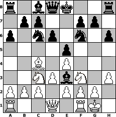 game notation in PGN-format [Event "FINEST GREEN"] [Site "www.myChess.de"] [Date "2009.10.15"] [Round "1"] [White "Andylein1989"] [Black "Master1"] [ECO "C55"] [WhitemyELO "1502"] [BlackmyELO "1314"] [Result "0-1"] [TimeControl "10/864000"] [WhiteDays "00"] [BlackDays "06"] [MyChessNo "59856"] 1. e4 e5 2. Nf3 Nc6 3. Bc4 Nf6 4. O-O Bc5 5. d3 d6 6. h3 a6 7. Nc3 h6 8. Be3 Bxe3 0-1 position notation in FEN-format r1bqk2r/1pp2pp1/p1np1n1p/4p3/2B1P3/2NPbN1P/PPP1PPP1/R2Q1RK1 - kq - 0 9 Captured white pieces: Captured black pieces: Click on a captured piece in order to display the desired move!
