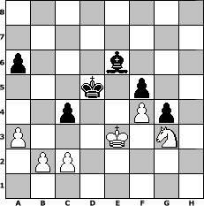 game notation in PGN-format [Event "R"] [Site "www.myChess.de"] [Date "2005.05.22"] [Round "1"] [White "Andreas"] [Black "NoBody"] [ECO "B55"] [WhitemyELO "1684"] [BlackmyELO "1729"] [Result "1/2-1/2"] [TimeControl "10/864000"] [WhiteDays "10"] [BlackDays "10"] [MyChessNo "13282"] 1. e4 c5 2. Nf3 d6 3. d4 cxd4 4. Nxd4 Nf6 5. Bd3 a6 6. O-O e5 7. Nf5 d5 8. Ng3 dxe4 9. Nxe4 Nxe4 10. Bxe4 Qxd1 11. Rxd1 f5 12. Bd5 Nc6 13. Bxc6+ bxc6 14. Bg5 Be7 15. Bxe7 Kxe7 16. Nc3 Be6 17. Rd2 Rhd8 18. Rad1 Rxd2 19. Rxd2 Rd8 20. Rxd8 Kxd8 21. f3 Kc7 22. Kf2 g5 23. g3 c5 24. Ke3 Kc6 25. a3 c4 26. h4 h6 27. hxg5 hxg5 28. f4 exf4+ 29. gxf4 g4 30. Ne2 Kc5 31. Nd4 Kd5 32. Ne2 Bd7 33. Ng3 Be6 1/2-1/2 position notation in FEN-format 8/8/p3b3/3k1p2/2p2Pp1/P3K1N1/1PP5/8 - - - 8 34 Captured white pieces: ![]() ![]() ![]() ![]() ![]() ![]() ![]() ![]() ![]() ![]() ![]() ![]() ![]() ![]() ![]() Captured black pieces: ![]() ![]() ![]() ![]() ![]() ![]() ![]() ![]() ![]() ![]() ![]() ![]() ![]() ![]() ![]() Click on a captured piece in order to display the desired move!