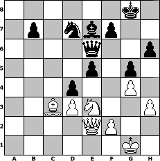 game notation in PGN-format [Event "Dabei ist alles 3"] [Site "www.myChess.de"] [Date "2008.05.14"] [Round "1"] [White "Knight"] [Black "ujack1961"] [ECO "A00"] [WhitemyELO "1255"] [BlackmyELO "1693"] [Result "0-1"] [TimeControl "10/864000"] [WhiteDays "10"] [BlackDays "10"] [MyChessNo "44852"] 1. b4 c6 2. Bb2 Qb6 3. a3 a5 4. e4 axb4 5. axb4 Rxa1 6. Bxa1 Qxb4 7. Nc3 e5 8. Nf3 d6 9. Be2 Nf6 10. O-O Nxe4 11. Nxe4 Qxe4 12. d3 Qg6 13. Nh4 Qf6 14. g3 Bh3 15. Re1 Be7 16. Bf3 Nd7 17. Bg2 Bxg2 18. Nxg2 O-O 19. c4 Ra8 20. Bc3 Ra2 21. Re2 Rxe2 22. Qxe2 h6 23. Nh4 g5 24. Ng2 Qf5 25. g4 Qe6 26. Ne3 d5 27. cxd5 cxd5 28. h3 d4 0-1 position notation in FEN-format 6k1/1p1nbp2/4q2p/4p1p1/3p2P1/2BPN2P/4QP2/6K1 - - - 0 29 Captured white pieces: Captured black pieces: Click on a captured piece in order to display the desired move!