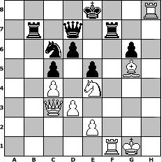 game notation in PGN-format [Event "Zwischendurch mal ein paar eigene Z"] [Site "www.myChess.de"] [Date "2009.06.25"] [Round "1"] [White "SlowBrain"] [Black "Matti"] [ECO "C50"] [WhitemyELO "1451"] [BlackmyELO "1465"] [Result "1-0"] [TimeControl "10/1728000"] [WhiteDays "095"] [BlackDays "100"] [MyChessNo "56966"] 1. e4 e5 2. Nf3 Nc6 3. Bc4 Bc5 4. O-O Nf6 5. Nc3 d6 6. d3 h6 7. Na4 Bb6 8. Nxb6 axb6 9. a3 O-O 10. h3 Qe7 11. Re1 Na5 12. Ba2 Bd7 13. c3 Bb5 14. a4 Bd7 15. b3 b5 16. axb5 Nxb3 17. Qxb3 Be6 18. c4 Ra7 19. Be3 Raa8 20. Qc3 c6 21. bxc6 bxc6 22. Bb3 Rab8 23. Nd2 c5 24. f4 Nd7 25. f5 Bxf5 26. exf5 Rfd8 27. Ne4 Nb6 28. Rf1 Nd7 29. Rf2 Rb7 30. Raf1 f6 31. g4 Rf8 32. Ba4 Nb8 33. Bc6 Nxc6 34. h4 Kf7 35. g5 hxg5 36. hxg5 fxg5 37. Bxg5 Qd7 38. f6 g6 39. Rh2 Ke8 40. f7+ Rxf7 41. Rh8+ 1-0 position notation in FEN-format 4k2R/1r1q1r2/2np2p1/2p1p1B1/2P1N3/2QP4/4P3/5RK1 - - - 1 41 Captured white pieces: Captured black pieces: Click on a captured piece in order to display the desired move!