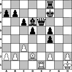 | game notation in PGN-format [Event "spass mit m"] [Site "www.myChess.de"] [Date "2005.03.21"] [Round "1"] [White "Sanji"] [Black "duc"] [ECO "D04"] [WhitemyELO "1454"] [BlackmyELO "1394"] [Result "0-1"] [TimeControl "10/3456000"] [WhiteDays "119"] [BlackDays "093"] [MyChessNo "11347"] 1. d4 d5 2. Nf3 Nf6 3. e3 Nc6 4. Bd3 Bg4 5. c3 e5 6. dxe5 Bxf3 7. Qxf3 Nxe5 8. Qd1 Bc5 9. Bc2 O-O 10. O-O Qd6 11. Nd2 c6 12. Nf3 Bb6 13. e4 Nxf3+ 14. gxf3 Nxe4 15. Bxe4 Bc7 16. Bxh7+ Kxh7 17. Qd3+ g6 18. f4 f5 19. Bd2 Rg8 20. Rae1 Raf8 21. Qh3+ Kg7 22. Qh4 Kf7 23. Re2 g5 24. Qh5+ Rg6 25. Rfe1 gxf4+ 26. Qxg6+ Qxg6+ 27. Kh1 Bd6 28. Re6 Qxe6 0-1 position notation in FEN-format 5r2/pp3k2/2pbq3/3p1p2/5p2/2P5/PP1B1P1P/4R2K - - - 0 29 Captured white pieces:                              Captured black pieces:                               Click on a captured piece in order to display the desired move!