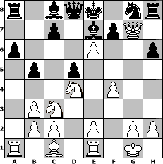 game notation in PGN-format [Event "Jagdvariante - die Zweite"] [Site "www.myChess.de"] [Date "2006.06.07"] [Round "1"] [White "WalterKelsch7"] [Black "nogumo"] [ECO "C70"] [WhitemyELO "1684"] [BlackmyELO "1863"] [Result "1-0"] [TimeControl "10/2592000"] [WhiteDays "51"] [BlackDays "60"] [MyChessNo "25962"] 1. e4 e5 2. Nf3 Nc6 3. Bb5 a6 4. Ba4 b5 5. Bb3 Na5 6. O-O Nxb3 7. axb3 d6 8. d4 exd4 9. Nxd4 Bb7 10. Nc3 Be7 11. Re1 Bg5 12. e5 d5 13. Qg4 h6 14. f4 Bc8 15. e6 Be7 16. Qxg7 1-0 position notation in FEN-format r1bqk1nr/2p1bpQ1/p3P2p/1p1p4/3N1P2/1PN5/1PP1P1PP/R1B1R1K1 - kq - 0 16 Captured white pieces: ![]() ![]() ![]() ![]() ![]() ![]() ![]() ![]() ![]() ![]() ![]() ![]() ![]() ![]() ![]() Captured black pieces: ![]() ![]() ![]() ![]() ![]() ![]() ![]() ![]() ![]() ![]() ![]() ![]() ![]() ![]() ![]() Click on a captured piece in order to display the desired move!