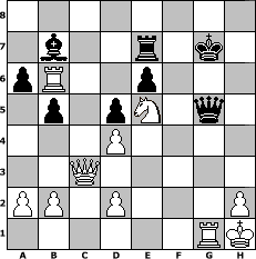 game notation in PGN-format [Event "QGD: Orthodox Verteidigung"] [Site "www.myChess.de"] [Date "2008.08.11"] [Round "1"] [White "neve"] [Black "scherry"] [ECO "D65"] [WhitemyELO "1466"] [BlackmyELO "1339"] [Result "1-0"] [TimeControl "10/2592000"] [WhiteDays "120"] [BlackDays "110"] [MyChessNo "47051"] 1. d4 d5 2. c4 e6 3. Nc3 Nf6 4. Bg5 Be7 5. e3 O-O 6. Nf3 Nbd7 7. Rc1 c6 8. Qc2 a6 9. cxd5 Nxd5 10. Bxe7 Qxe7 11. Bd3 N7f6 12. O-O b5 13. e4 Nf4 14. e5 N6d5 15. Nxd5 cxd5 16. Bxh7+ Kh8 17. Bd3 Nxd3 18. Qxd3 g6 19. Qe3 Kg7 20. Ng5 f6 21. exf6+ Qxf6 22. f4 Ra7 23. Rc6 Re8 24. Qh3 Rh8 25. Qg4 Re7 26. Nf3 Qf5 27. Qg3 Bb7 28. Rb6 Qf6 29. Ne5 Rh6 30. f5 Bc8 31. fxg6 Rxg6 32. Qc3 Rxg2+ 33. Kxg2 Qg5+ 34. Kh1 Bb7 35. Rg1 1-0 position notation in FEN-format 8/1b2r1k1/pR2p3/1p1pN1q1/3P4/2Q5/PP1P3P/6RK - - - 4 35 Captured white pieces: ![]() ![]() ![]() ![]() ![]() ![]() ![]() ![]() ![]() ![]() ![]() ![]() ![]() ![]() ![]() Captured black pieces: ![]() ![]() ![]() ![]() ![]() ![]() ![]() ![]() ![]() ![]() ![]() ![]() ![]() ![]() ![]() Click on a captured piece in order to display the desired move!