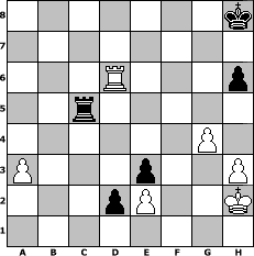 game notation in PGN-format [Event "Für die kalten Tage..."] [Site "www.myChess.de"] [Date "2018.02.09"] [Round "2"] [White "Rotstift10"] [Black "Joschi"] [ECO "B13"] [WhitemyELO "1579"] [BlackmyELO "1544"] [Result "0-1"] [TimeControl "10/1728000"] [WhiteDays "20"] [BlackDays "20"] [MyChessNo "111373"] 1. e4 c6 2. d4 d5 3. exd5 cxd5 4. Nc3 Nf6 5. h3 Nc6 6. Nf3 e6 7. Bb5 a6 8. Bxc6+ bxc6 9. Ne5 Bb7 10. a3 c5 11. dxc5 Bxc5 12. Bg5 Be7 13. Qd4 h6 14. Bh4 O-O 15. O-O Rc8 16. Nd3 Nh5 17. Bxe7 Qxe7 18. Rfe1 Qc7 19. Re5 Nf6 20. f3 Nd7 21. Rh5 Nf6 22. Re5 Qd6 23. g4 Rc4 24. Qf2 Rfc8 25. Re1 d4 26. Ne4 Nxe4 27. fxe4 Rxc2 28. Qf4 a5 29. Rxa5 Qxf4 30. Nxf4 Rxb2 31. Nd3 Rb3 32. Nc5 Rb2 33. Rd1 Rd8 34. Ra7 Bc6 35. Rc7 Ba8 36. Rf1 Rf8 37. Rf2 Rb1+ 38. Kh2 Ra1 39. Rf3 f5 40. Nxe6 Bxe4 41. Rxg7+ Kh8 42. Rf4 Rf6 43. Re7 d3 44. Rf2 Rc1 45. Nc5 Rxc5 46. Rxe4 fxe4 47. Rxf6 d2 48. Rd6 e3 0-1 position notation in FEN-format 7k/8/3R3p/2r5/6P1/P3p2P/3pP2K/8 - - - 0 49 Captured white pieces: Captured black pieces: Click on a captured piece in order to display the desired move!