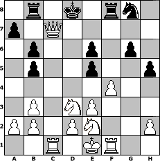 | game notation in PGN-format [Event "Wanderpokal November 2006 -"] [Site "www.myChess.de"] [Date "2006.12.01"] [Round "1"] [White "nordlicht"] [Black "tuergeist"] [Variant "Fischerrandom"] [SetUp "1"] [FEN "brnbkrnq/pppppppp/8/8/8/8/PPPPPPPP/BRNBKRNQ w KQkq - 0 1"] [WhitemyELO "1969"] [BlackmyELO "1273"] [Result "1-0"] [TimeControl "10/864000"] [WhiteDays "10"] [BlackDays "04"] [MyChessNo "30668"] 1. b3 f6 2. e3 c6 3. Nd3 Nd6 4. g4 b6 5. Bf3 g6 6. Ne2 f5 7. Bxh8 fxg4 8. Bxg4 e6 9. Be5 Bc7 10. f4 Nb5 11. c4 h5 12. cxb5 cxb5 13. Bf3 Bxf3 14. Qxf3 d6 15. Qc6+ Kd8 16. Rc1 dxe5 17. Qxc7+ 1-0 position notation in FEN-format 1r1k1rn1/p1Q5/1p2p1p1/1p2p2p/5P2/1P1NP3/PP1PN2P/2R1KR2 - K - 0 17 Captured white pieces:                              Captured black pieces:                               Click on a captured piece in order to display the desired move!