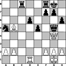 game notation in PGN-format [Event "Schach im Mittelalter: Tugend der Ritter"] [Site "www.myChess.de"] [Date "2016.12.17"] [Round "1"] [White "Joschi"] [Black "Helmut48"] [ECO "B58"] [WhitemyELO "1591"] [BlackmyELO "2064"] [Result "0-1"] [TimeControl "10/2592000"] [WhiteDays "90"] [BlackDays "85"] [MyChessNo "106050"] 1. e4 c5 2. Nf3 d6 3. d4 cxd4 4. Nxd4 Nf6 5. Nc3 Nc6 6. Be2 e5 7. Nf3 h6 8. O-O Be7 9. Be3 O-O 10. Qd2 Be6 11. Rfd1 Rc8 12. Nb5 Nxe4 13. Qd3 Bf5 14. Qb3 Na5 15. Qa4 a6 16. Na3 b5 17. Nxb5 axb5 18. Bxb5 Ng5 19. Nxg5 Bxc2 20. Qg4 Bxd1 21. Rxd1 Bxg5 22. Bxg5 Qxg5 0-1 position notation in FEN-format 2r2rk1/5pp1/3p3p/nB2p1q1/6Q1/8/PP3PPP/3R2K1 - - - 0 23 Captured white pieces: Captured black pieces: Click on a captured piece in order to display the desired move!