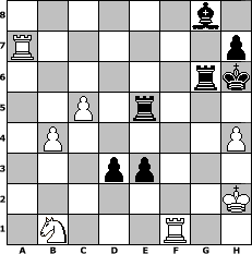 game notation in PGN-format [Event "November-Open 1/6"] [Site "www.myChess.de"] [Date "2007.11.05"] [Round "1"] [White "nordlicht"] [Black "Plaidroller"] [ECO "B30"] [WhitemyELO "2028"] [BlackmyELO "1716"] [Result "0-1"] [TimeControl "10/1728000"] [WhiteDays "09"] [BlackDays "19"] [MyChessNo "39425"] 1. e4 c5 2. Nf3 Nc6 3. Bb5 d6 4. d4 cxd4 5. Nxd4 Bd7 6. Nc3 Nf6 7. O-O g6 8. Bxc6 bxc6 9. Nf3 Bg7 10. e5 dxe5 11. Nxe5 Qc7 12. Re1 Be6 13. Qf3 Nd5 14. Qg3 Rc8 15. Nxd5 cxd5 16. c3 O-O 17. Bf4 Qb7 18. Re2 Rfe8 19. Be3 f6 20. Nf3 Bf7 21. Rae1 e5 22. Qh4 Rc4 23. Qg3 a5 24. Bc1 Qc8 25. Nd2 Rc6 26. Nb1 d4 27. b3 a4 28. c4 f5 29. Bb2 axb3 30. axb3 e4 31. Rd2 Qd8 32. Red1 d3 33. Bxg7 Kxg7 34. Ra2 Qd6 35. Qxd6 Rxd6 36. g3 g5 37. Ra5 Kf6 38. Nd2 f4 39. Rf1 Kg6 40. Ra7 Bg8 41. c5 Rc6 42. gxf4 gxf4 43. b4 e3 44. Nb1 Kh6 45. h4 Rg6+ 46. Kh2 Re5 47. fxe3 fxe3 0-1 position notation in FEN-format 6b1/R6p/6rk/2P1r3/1P5P/3pp3/7K/1N3R2 - - - 0 48 Captured white pieces: ![]() ![]() ![]() ![]() ![]() ![]() ![]() ![]() ![]() ![]() ![]() ![]() ![]() ![]() ![]() Captured black pieces: ![]() ![]() ![]() ![]() ![]() ![]() ![]() ![]() ![]() ![]() ![]() ![]() ![]() ![]() ![]() Click on a captured piece in order to display the desired move!