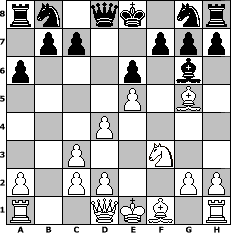 game notation in PGN-format [Event "Gegen die Sommerflaute"] [Site "www.myChess.de"] [Date "2013.07.17"] [Round "1"] [White "Knight"] [Black "faustballer"] [ECO "D00"] [WhitemyELO "1230"] [BlackmyELO "1537"] [Result "1-0"] [TimeControl "10/864000"] [WhiteDays "10"] [BlackDays "00"] [MyChessNo "89348"] 1. d4 d5 2. e4 dxe4 3. Nc3 Bf5 4. f3 a6 5. fxe4 Bg6 6. Nf3 e6 7. e5 Bb4 8. Bg5 Bxc3+ 9. bxc3 1-0 position notation in FEN-format rn1qk1nr/1pp2ppp/p3p1b1/4P1B1/3P4/2P2N2/P1PP2PP/R2QKB1R - KQkq - 0 9 Captured white pieces: Captured black pieces: Click on a captured piece in order to display the desired move!