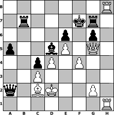 game notation in PGN-format [Event "9er4"] [Site "www.myChess.de"] [Date "2014.01.18"] [Round "1"] [White "espero"] [Black "alibengali"] [ECO "A45"] [WhitemyELO "1662"] [BlackmyELO "1655"] [Result "1-0"] [TimeControl "10/3456000"] [WhiteDays "37"] [BlackDays "40"] [MyChessNo "92375"] 1. d4 Nf6 2. Bg5 Ne4 3. Bf4 Nc6 4. Nd2 Nxd2 5. Qxd2 d5 6. e3 e6 7. Nf3 Bd6 8. Bg3 O-O 9. Bd3 Re8 10. Ne5 Nxe5 11. Bxe5 Bxe5 12. dxe5 a6 13. f4 c5 14. c3 c4 15. Bc2 b5 16. O-O-O Bb7 17. Qe2 a5 18. Qh5 g6 19. Qh6 b4 20. h4 Re7 21. h5 Qf8 22. hxg6 fxg6 23. Qg5 bxc3 24. bxc3 Rg7 25. Rh6 Qa3+ 26. Kd2 d4 27. exd4 Qxa2 28. Qg4 Bd5 29. Rdh1 Rb8 30. Rxh7 Rbb7 31. Rh8+ Kf7 32. Qg5 1-0 position notation in FEN-format 7R/1r3kr1/4p1p1/p2bP1Q1/2pP1P2/2P5/q1BK2P1/7R - - - 4 32 Captured white pieces: Captured black pieces: Click on a captured piece in order to display the desired move!