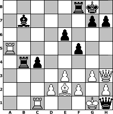 game notation in PGN-format [Event "MySchachOpen"] [Site "www.myChess.de"] [Date "2005.01.22"] [Round "2"] [White "PublicEnemy"] [Black "UPS"] [ECO "D01"] [WhitemyELO "1233"] [BlackmyELO "1638"] [Result "0-1"] [TimeControl "10/2592000"] [WhiteDays "39"] [BlackDays "86"] [MyChessNo "9952"] 1. d4 d5 2. Nc3 Nf6 3. g3 Nc6 4. Bg2 e6 5. Nf3 Bb4 6. Ne5 Nxe5 7. dxe5 Ng4 8. O-O Nxe5 9. Qd4 Bd6 10. Nb5 O-O 11. Bf4 c5 12. Qa4 a6 13. Nxd6 Qxd6 14. Bxe5 Qxe5 15. e3 Qxb2 16. Rfb1 Qe5 17. c4 dxc4 18. Qxc4 b5 19. Qh4 Rb8 20. Be4 f5 21. Bf3 a5 22. Qh3 c4 23. a3 b4 24. axb4 Rxb4 25. Be2 Qe4 26. Rc1 Bb7 27. Rxa5 Qh1# 0-1 position notation in FEN-format 5rk1/1b4pp/4p3/R4p2/1rp5/4P1PQ/3PBP1P/2R3Kq - - - 1 28 Captured white pieces: Captured black pieces: Click on a captured piece in order to display the desired move!