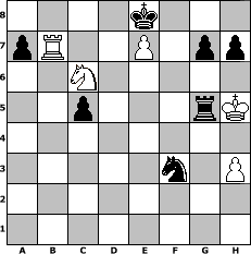 game notation in PGN-format [Event "unter uns Nr. 17"] [Site "www.myChess.de"] [Date "2014.02.13"] [Round "1"] [White "Knight"] [Black "Wulfen49"] [ECO "A50"] [WhitemyELO "1233"] [BlackmyELO "1223"] [Result "0-1"] [TimeControl "10/864000"] [WhiteDays "39"] [BlackDays "39"] [MyChessNo "92908"] 1. d4 Nf6 2. c4 d5 3. e3 e6 4. Nc3 Bb4 5. Bd2 Ne4 6. Nf3 O-O 7. Bd3 Nxc3 8. Bxc3 dxc4 9. Bxc4 Be7 10. O-O c5 11. d5 exd5 12. Bxd5 Be6 13. e4 Nc6 14. Bxe6 Qxd1 15. Bxf7+ Rxf7 16. Raxd1 Rd8 17. Rxd8+ Nxd8 18. Rd1 Ne6 19. Ne5 Rf8 20. Rd7 Bf6 21. Rxb7 Rd8 22. h3 Nd4 23. Ng4 Ne2+ 24. Kf1 Bxc3 25. bxc3 Nxc3 26. f3 Rd1+ 27. Kf2 Rd2+ 28. Kg3 Ne2+ 29. Kh4 Rxa2 30. e5 Nf4 31. Rb8+ Kf7 32. Rb7+ Kg6 33. e6 Nxg2+ 34. Kg3 Ne1 35. e7 Kf7 36. Ne5+ Ke8 37. Nc6 Rg2+ 38. Kh4 Nxf3+ 39. Kh5 Rg5# 0-1 position notation in FEN-format 4k3/pR2P1pp/2N5/2p3rK/8/5n1P/8/8 - - - 2 40 Captured white pieces: Captured black pieces: Click on a captured piece in order to display the desired move!