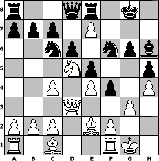 game notation in PGN-format [Event "7er2"] [Site "www.myChess.de"] [Date "2015.11.13"] [Round "1"] [White "spiderman"] [Black "atlantis"] [ECO "A15"] [WhitemyELO "1771"] [BlackmyELO "1504"] [Result "1-0"] [TimeControl "10/3456000"] [WhiteDays "69"] [BlackDays "79"] [MyChessNo "101222"] 1. c4 Nf6 2. Nf3 g6 3. Nc3 Bg7 4. e4 d6 5. d4 O-O 6. Be2 e5 7. O-O Nc6 8. d5 Ne7 9. Be3 Ne8 10. h3 f5 11. Ng5 f4 12. Bc1 h6 13. Ne6 Bxe6 14. dxe6 Nf6 15. h4 h5 16. Qd3 Re8 17. g3 Bh6 18. Nd5 Nc6 19. e7 1-0 position notation in FEN-format r2qr1k1/ppp1P3/2np1npb/3Np2p/2P1Pp1P/3Q2P1/PPP1BP2/R1B2RK1 - - - 0 19 Captured white pieces: Captured black pieces: Click on a captured piece in order to display the desired move!