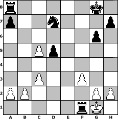 game notation in PGN-format [Event "Gothic 100"] [Site "www.myChess.de"] [Date "2005.08.23"] [Round "1"] [White "Falcor"] [Black "Knight"] [ECO "C01"] [WhitemyELO "1603"] [BlackmyELO "1525"] [Result "0-1"] [TimeControl "10/2592000"] [WhiteDays "108"] [BlackDays "120"] [MyChessNo "16594"] 1. e4 e6 2. d4 d5 3. Be3 Nf6 4. e5 Nfd7 5. Nf3 Nc6 6. Bb5 Bb4+ 7. c3 Ba5 8. Qd2 f6 9. Bxc6 bxc6 10. O-O Ba6 11. Re1 O-O 12. Qc2 fxe5 13. Ng5 g6 14. Nxe6 Qf6 15. Nxc7 Bxc7 16. Bh6 Rfe8 17. Nd2 e4 18. Nb3 Bc4 19. Nd2 Bd3 20. Qd1 Bf4 21. Bxf4 Qxf4 22. f3 e3 23. Nf1 e2 24. Rxe2 Bxe2 25. Qc2 Bxf1 26. Rxf1 c5 27. dxc5 Qe3+ 28. Rf2 Qe1+ 29. Rf1 Qe3+ 30. Qf2 Qxf2+ 31. Rxf2 Re1+ 32. Rf1 Rxf1+ 0-1 position notation in FEN-format r5k1/p2n3p/6p1/2Pp4/8/2P2P2/PP4PP/5rK1 - - - 0 33 Captured white pieces: ![]() ![]() ![]() ![]() ![]() ![]() ![]() ![]() ![]() ![]() ![]() ![]() ![]() ![]() ![]() Captured black pieces: ![]() ![]() ![]() ![]() ![]() ![]() ![]() ![]() ![]() ![]() ![]() ![]() ![]() ![]() ![]() Click on a captured piece in order to display the desired move!
