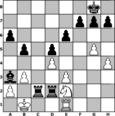 game notation in PGN-format [Event "Aprilturnier"] [Site "www.myChess.de"] [Date "2016.04.22"] [Round "1"] [White "alpacino"] [Black "FrankB"] [ECO "D02"] [WhitemyELO "1306"] [BlackmyELO "1624"] [Result "0-1"] [TimeControl "10/1728000"] [WhiteDays "54"] [BlackDays "31"] [MyChessNo "103359"] 1. d4 d5 2. Nf3 Nf6 3. Nc3 Bf5 4. h3 e6 5. Bd2 Nbd7 6. e3 c5 7. Bd3 Bxd3 8. cxd3 a6 9. Ne5 Bd6 10. Ng4 cxd4 11. exd4 Qb6 12. Nxf6+ Nxf6 13. b3 Qxd4 14. Qe2 O-O 15. Qe3 Qxe3+ 16. fxe3 Rac8 17. O-O-O b5 18. Kb2 Nd7 19. d4 Nf6 20. Ne2 Ne4 21. Rhf1 Rc6 22. Kb1 Rfc8 23. g4 Ba3 24. h4 Rc2 25. g5 Nxd2+ 26. Rxd2 Rxd2 27. Re1 Rcc2 0-1 position notation in FEN-format 6k1/5ppp/p3p3/1p1p2P1/3P3P/bP2P3/P1rrN3/1K2R3 - - - 2 28 Captured white pieces: Captured black pieces: Click on a captured piece in order to display the desired move!