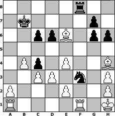 game notation in PGN-format [Event "Albspiele 23"] [Site "www.myChess.de"] [Date "2012.08.08"] [Round "1"] [White "augustus"] [Black "ndziemba"] [ECO "C50"] [WhitemyELO "1240"] [BlackmyELO "1436"] [Result "1-0"] [TimeControl "10/1728000"] [WhiteDays "19"] [BlackDays "20"] [MyChessNo "83258"] 1. e4 e5 2. Nf3 Nc6 3. Bc4 Bd6 4. d3 Nf6 5. Ng5 Rf8 6. Be3 Be7 7. c3 h6 8. Nh3 d6 9. O-O Bg4 10. f3 Bxh3 11. gxh3 Nh5 12. f4 Bh4 13. Qxh5 Qf6 14. b4 O-O-O 15. fxe5 Qg6+ 16. Qxg6 fxg6 17. Na3 Nxe5 18. Bxa7 Nf3+ 19. Kh1 c6 20. Be6+ Kc7 21. Nc4 b5 22. Bb6+ Kb7 23. Bxd8 bxc4 24. Bxh4 1-0 position notation in FEN-format 5r2/1k4p1/2ppB1pp/8/1Pp1P2B/2PP1n1P/P3P2P/R4R1K - - - 0 24 Captured white pieces: Captured black pieces: Click on a captured piece in order to display the desired move!