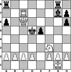 game notation in PGN-format [Event "Das Jahr 2008"] [Site "www.myChess.de"] [Date "2007.12.23"] [Round "2"] [White "kischok46"] [Black "Jojo22"] [ECO "A40"] [WhitemyELO "2053"] [BlackmyELO "1346"] [Result "1-0"] [TimeControl "10/2592000"] [WhiteDays "90"] [BlackDays "90"] [MyChessNo "40910"] 1. d4 b6 2. e4 Bb7 3. Bd3 d5 4. e5 c5 5. e6 Nh6 6. Bxh6 gxh6 7. Qh5 Qd6 8. Qxf7+ Kd8 9. Nf3 Nc6 10. dxc5 bxc5 11. O-O Kc7 12. Nc3 a6 13. Rfe1 Nd8 14. Qf5 Rg8 15. Rad1 c4 16. Bxc4 Bg7 17. Bxd5 Bxd5 18. Rxd5 Qc6 19. Rd7+ Kb8 20. Qf4+ Kc8 21. Nd5 Nxe6 22. Rxe6 Kxd7 23. Rxc6 e5 24. Rc7+ Kd6 25. Qa4 Kxd5 26. Qc6# 1-0 position notation in FEN-format r5r1/2R3bp/p1Q4p/3kp3/8/5N2/PPPP1PPP/6K1 - - - 1 26 Captured white pieces: ![]() ![]() ![]() ![]() ![]() ![]() ![]() ![]() ![]() ![]() ![]() ![]() ![]() ![]() ![]() Captured black pieces: ![]() ![]() ![]() ![]() ![]() ![]() ![]() ![]() ![]() ![]() ![]() ![]() ![]() ![]() ![]() Click on a captured piece in order to display the desired move!
