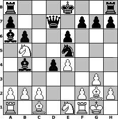 game notation in PGN-format [Event "Endlich Fr"] [Site "www.myChess.de"] [Date "2014.03.25"] [Round "1"] [White "Macks"] [Black "Andylein1989"] [ECO "A30"] [WhitemyELO "1426"] [BlackmyELO "1489"] [Result "0-1"] [TimeControl "10/1728000"] [WhiteDays "40"] [BlackDays "40"] [MyChessNo "93619"] 1. c4 c5 2. Nf3 Nc6 3. g3 Nf6 4. Nc3 e6 5. Bg2 d5 6. cxd5 Nxd5 7. O-O Be7 8. d3 b6 9. e4 Ndb4 10. Ne1 Ne5 11. d4 cxd4 12. Nb5 Ba6 13. Qa4 Qd7 14. Qxb4 Bxb4 0-1 position notation in FEN-format r3k2r/p2q1ppp/bp2p3/1N2n3/1b1pP3/6P1/PPP2PBP/R1B1NRK1 - kq - 0 15 Captured white pieces: Captured black pieces: Click on a captured piece in order to display the desired move!