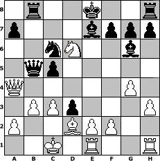 game notation in PGN-format [Event "Dabei ist alles 8"] [Site "www.myChess.de"] [Date "2009.11.12"] [Round "1"] [White "alpacino"] [Black "neve"] [ECO "B51"] [WhitemyELO "1312"] [BlackmyELO "1470"] [Result "1-0"] [TimeControl "10/864000"] [WhiteDays "10"] [BlackDays "10"] [MyChessNo "60634"] 1. e4 c5 2. Nf3 d6 3. Bb5+ Nc6 4. Bxc6+ bxc6 5. c3 e5 6. d3 Bg4 7. h3 Bh5 8. Na3 d5 9. g4 Bg6 10. Nxe5 dxe4 11. Qa4 Ne7 12. Nxc6 Qd7 13. Nc4 Nxc6 14. Be3 Rb8 15. O-O-O exd3 16. Bd2 Be7 17. Rde1 Qb7 18. b3 Qb5 19. Nd6+ 1-0 position notation in FEN-format 1r2k2r/p3bppp/2nN2b1/1qp5/Q5P1/1PPp3P/P2BPP2/2K1R2R - k - 2 19 Captured white pieces: Captured black pieces: Click on a captured piece in order to display the desired move!
