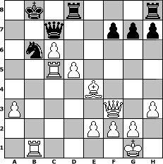 game notation in PGN-format [Event "JN OPEN 40/10 1"] [Site "www.myChess.de"] [Date "2016.01.25"] [Round "1"] [White "atlantis"] [Black "sprinterde"] [ECO "B32"] [WhitemyELO "1639"] [BlackmyELO "1800"] [Result "1-0"] [TimeControl "10/3456000"] [WhiteDays "40"] [BlackDays "40"] [MyChessNo "102205"] 1. e4 c5 2. Nf3 Nc6 3. d4 e6 4. d5 exd5 5. exd5 Nce7 6. c4 Qa5+ 7. Nc3 d6 8. Bd3 Bg4 9. h3 Bh5 10. O-O O-O-O 11. a3 Kb8 12. Bd2 Qa6 13. b4 Nc8 14. Bf4 Nge7 15. bxc5 Ng6 16. Bh2 Qa5 17. Nb5 a6 18. Rb1 axb5 19. Rxb5 Qc7 20. c6 Bxf3 21. Qxf3 b6 22. c5 Ne5 23. Bxe5 dxe5 24. cxb6 Nxb6 25. Rfb1 Bc5 26. Rxc5 e4 27. Bxe4 1-0 position notation in FEN-format 1k1r3r/2q2ppp/1nP5/2RP4/4B3/P4Q1P/4PPP1/1R4K1 - - - 0 27 Captured white pieces: ![]() ![]() ![]() ![]() ![]() ![]() ![]() ![]() ![]() ![]() ![]() ![]() ![]() ![]() ![]() Captured black pieces: ![]() ![]() ![]() ![]() ![]() ![]() ![]() ![]() ![]() ![]() ![]() ![]() ![]() ![]() ![]() Click on a captured piece in order to display the desired move!
