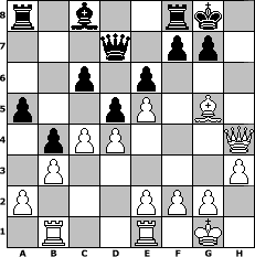| game notation in PGN-format [Event "Mail"] [Site "www.myChess.de"] [Date "2012.05.01"] [Round "1"] [White "fred521"] [Black "Haki"] [ECO "B01"] [WhitemyELO "1313"] [BlackmyELO "1334"] [Result "1-0"] [TimeControl "10/864000"] [WhiteDays "10"] [BlackDays "10"] [MyChessNo "81405"] 1. e4 d5 2. e5 Nc6 3. d4 h5 4. Nc3 Nh6 5. Bg5 Qd7 6. Nf3 e6 7. Bb5 a6 8. Ba4 Bb4 9. h3 Bxc3+ 10. bxc3 b5 11. Bb3 Na5 12. Rb1 Nxb3 13. cxb3 O-O 14. Nh4 c6 15. O-O a5 16. Re1 b4 17. c4 Nf5 18. Qxh5 Nxh4 19. Qxh4 1-0 position notation in FEN-format r1b2rk1/3q1pp1/2p1p3/p2pP1B1/1pPP3Q/1P5P/P3PPP1/1R2R1K1 - - - 0 19 Captured white pieces:                              Captured black pieces:                               Click on a captured piece in order to display the desired move!