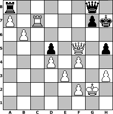 game notation in PGN-format [Event "Sommerferien 2010"] [Site "www.myChess.de"] [Date "2010.06.20"] [Round "2"] [White "sprinterde"] [Black "Winston"] [ECO "D06"] [WhitemyELO "1668"] [BlackmyELO "1467"] [Result "1-0"] [TimeControl "10/2592000"] [WhiteDays "177"] [BlackDays "180"] [MyChessNo "66422"] 1. d4 d5 2. c4 h6 3. Nc3 Nf6 4. Qa4+ Bd7 5. Qb3 Bc6 6. e3 e6 7. Nf3 Nbd7 8. Be2 dxc4 9. Bxc4 Bxf3 10. gxf3 Nh7 11. Qxb7 Bd6 12. Bb5 O-O 13. Bc6 Nb6 14. Qa6 Rc8 15. f4 Nf6 16. Bd2 Ng4 17. h3 Nf6 18. a4 Nfd5 19. Nxd5 Nxd5 20. Qxa7 Bb4 21. Bxb4 Nxb4 22. Be4 f5 23. Qc5 Rb8 24. Bb1 Qh4 25. Qc4 Nd5 26. Qc1 Rb3 27. Ra3 Rfb8 28. Rxb3 Rxb3 29. Kf1 Rb8 30. Ba2 Qd8 31. Rg1 Qd7 32. Bxd5 exd5 33. Rg6 Qf7 34. Rc6 Rc8 35. a5 Kf8 36. Qc5+ Kg8 37. a6 Ra8 38. Rxc7 Qe6 39. Rc6 Qd7 40. Qb6 Kh7 41. b4 Qe7 42. Rc7 Qh4 43. Kg2 Qd8 44. Qb7 Qg8 45. a7 h5 46. b5 Re8 47. Qc6 Ra8 48. b6 Qd8 49. Qd7 Qg8 50. Qxf5+ 1-0 position notation in FEN-format r5q1/P1R3pk/1P6/3p1Q1p/3P1P2/4P2P/5PK1/8 - - - 0 50 Captured white pieces: Captured black pieces: Click on a captured piece in order to display the desired move!