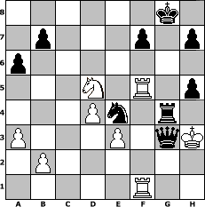 game notation in PGN-format [Event "1. Fr"] [Site "www.myChess.de"] [Date "2009.02.01"] [Round "1"] [White "BobbyF4"] [Black "muellerh"] [ECO "A00"] [WhitemyELO "1601"] [BlackmyELO "1554"] [Result "0-1"] [TimeControl "10/864000"] [WhiteDays "14"] [BlackDays "29"] [MyChessNo "52245"] 1. g4 d5 2. Bg2 e5 3. Nf3 e4 4. Nd4 c5 5. Nf5 Nf6 6. e3 g6 7. Ng3 Bxg4 8. f3 exf3 9. Bxf3 Bxf3 10. Qxf3 Bg7 11. O-O O-O 12. d3 Nc6 13. c3 Ne5 14. Qe2 Re8 15. Na3 a6 16. d4 cxd4 17. cxd4 Nc6 18. Qf3 Re7 19. Nc2 Qd7 20. Bd2 Rae8 21. Rac1 Ne4 22. Nxe4 Rxe4 23. Kh1 Bh6 24. a3 Nd8 25. h3 Rh4 26. Kg2 Ne6 27. Qg3 Rh5 28. h4 Bg5 29. Rf3 Bxh4 30. Qh3 Bd8 31. Qxh5 gxh5 32. Rcf1 Ng5 33. Rf5 Re4 34. Nb4 Rg4+ 35. Kh1 Ne4 36. Be1 Bh4 37. Nxd5 Bxe1 38. Rxe1 Ng3+ 39. Kh2 Ne4 40. Ref1 Qd6+ 41. Kh3 Qg3# 0-1 position notation in FEN-format 6k1/1p3p1p/p7/3N1R1p/3Pn1r1/P3P1qK/1P6/5R2 - - - 7 42 Captured white pieces: Captured black pieces: Click on a captured piece in order to display the desired move!