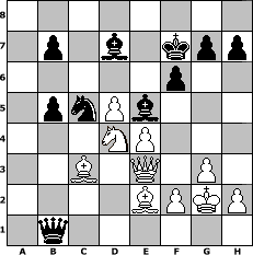 game notation in PGN-format [Event "Osterblitz"] [Site "www.myChess.de"] [Date "2006.04.14"] [Round "1"] [White "nogumo"] [Black "hermtz"] [ECO "A00"] [WhitemyELO "1761"] [BlackmyELO "1731"] [Result "1/2-1/2"] [TimeControl "10/86400"] [WhiteDays "01"] [BlackDays "01"] [MyChessNo "24515"] 1. b4 Nf6 2. Bb2 e6 3. b5 d5 4. e3 Bd6 5. Nf3 c6 6. c4 Bd7 7. a4 O-O 8. Qc2 Re8 9. Be2 e5 10. O-O e4 11. Ne1 a6 12. d3 axb5 13. axb5 Rxa1 14. Bxa1 cxb5 15. cxd5 exd3 16. Qxd3 Na6 17. Nf3 Nb4 18. Qd2 Ne4 19. Qd4 f6 20. Rc1 Qa5 21. Nbd2 Nxd2 22. Qxd2 Rc8 23. Bc3 Qa3 24. Bb2 Rxc1+ 25. Qxc1 Qa4 26. e4 Qb3 27. Nd4 Qa4 28. g3 Kf7 29. Kg2 Na6 30. Qb1 Be5 31. Qd3 Nc5 32. Qe3 Qa2 33. Bc3 Qb1 1/2-1/2 position notation in FEN-format 8/1p1b1kpp/5p2/1pnPb3/3NP3/2B1Q1P1/4BPKP/1q6 - - - 11 34 Captured white pieces: Captured black pieces: Click on a captured piece in order to display the desired move!