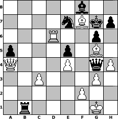 game notation in PGN-format [Event "Englische Spiele"] [Site "www.myChess.de"] [Date "2008.12.24"] [Round "2"] [White "muetoe"] [Black "rakl"] [ECO "A16"] [WhitemyELO "1951"] [BlackmyELO "1782"] [Result "1/2-1/2"] [TimeControl "10/1728000"] [WhiteDays "15"] [BlackDays "20"] [MyChessNo "50967"] 1. c4 Nf6 2. Nc3 g6 3. d4 Bg7 4. Nf3 O-O 5. g3 d5 6. cxd5 Nxd5 7. Bg2 c5 8. O-O cxd4 9. Nxd4 Nxc3 10. bxc3 Qc7 11. Qb3 a6 12. Rd1 e5 13. Nc2 Nc6 14. Ne3 Be6 15. Nd5 Bxd5 16. Bxd5 Rac8 17. Rb1 b5 18. a4 Rb8 19. Qa3 Ne7 20. Bb3 Rfc8 21. e4 Nc6 22. Bd5 Bf8 23. Qa2 bxa4 24. Rxb8 Rxb8 25. Qxa4 Ne7 26. Bc4 a5 27. Rd7 Qc8 28. Rd6 Rb7 29. Bg5 Qg4 30. Bxf7+ Kg7 31. h4 Rb1+ 1/2-1/2 position notation in FEN-format 5b2/4nBkp/3R2p1/p3p1B1/Q3P1qP/2P3P1/5P2/1r4K1 - - - 1 32 Captured white pieces: ![]() ![]() ![]() ![]() ![]() ![]() ![]() ![]() ![]() ![]() ![]() ![]() ![]() ![]() ![]() Captured black pieces: ![]() ![]() ![]() ![]() ![]() ![]() ![]() ![]() ![]() ![]() ![]() ![]() ![]() ![]() ![]() Click on a captured piece in order to display the desired move!