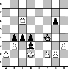 game notation in PGN-format [Event "Gedenkturnier f"] [Site "www.myChess.de"] [Date "2016.02.01"] [Round "1"] [White "deepsabel"] [Black "martinus"] [ECO "A46"] [WhitemyELO "2059"] [BlackmyELO "1803"] [Result "1-0"] [TimeControl "10/2592000"] [WhiteDays "113"] [BlackDays "114"] [MyChessNo "102343"] 1. d4 Nf6 2. Nf3 d6 3. Nc3 g6 4. e4 Bg7 5. Be2 O-O 6. O-O Nbd7 7. h3 Re8 8. e5 dxe5 9. dxe5 Nh5 10. e6 fxe6 11. Ng5 c5 12. Bxh5 gxh5 13. Nxe6 Qb6 14. Nxg7 Kxg7 15. Qxh5 Qg6 16. Qxg6+ hxg6 17. Bg5 Nf6 18. Rfe1 Bf5 19. Re2 a6 20. Rae1 e6 21. Bxf6+ Kxf6 22. Nd5+ exd5 23. Rxe8 Rxe8 24. Rxe8 Bxc2 25. Kf1 Bd3+ 26. Ke1 b5 27. Rc8 c4 28. Rc6+ Kf5 29. Rxa6 b4 30. Rc6 d4 31. Kd2 Kf4 32. b3 1-0 position notation in FEN-format 8/8/2R3p1/8/1ppp1k2/1P1b3P/P2K1PP1/8 - - - 0 32 Captured white pieces: Captured black pieces: Click on a captured piece in order to display the desired move!