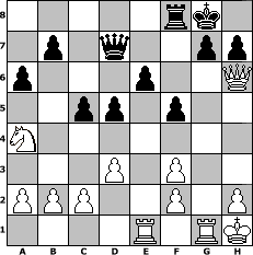 game notation in PGN-format [Event "8. Frankenwaldturnier"] [Site "www.myChess.de"] [Date "2009.01.20"] [Round "1"] [White "pelle"] [Black "brucybabe"] [ECO "B20"] [WhitemyELO "1572"] [BlackmyELO "1666"] [Result "1-0"] [TimeControl "10/864000"] [WhiteDays "29"] [BlackDays "30"] [MyChessNo "51901"] 1. e4 c5 2. Bc4 Nc6 3. Nc3 e6 4. d3 Nf6 5. Nge2 d5 6. e5 Nxe5 7. Bb5+ Bd7 8. O-O Bd6 9. Bf4 Qc7 10. Ng3 O-O 11. Bxd7 Qxd7 12. Bg5 Be7 13. Nh5 Nxh5 14. Qxh5 Nf3+ 15. gxf3 Bxg5 16. Qxg5 f5 17. Kh1 Rf6 18. Rg1 Raf8 19. Rae1 a6 20. Na4 Rh6 21. Qxh6 1-0 position notation in FEN-format 5rk1/1p1q2pp/p3p2Q/2pp1p2/N7/3P1P2/PPP2P1P/4R1RK - - - 0 21 Captured white pieces: Captured black pieces: Click on a captured piece in order to display the desired move!