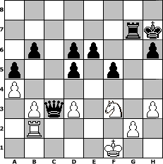 game notation in PGN-format [Event "Impfen ist Pflicht :-)"] [Site "www.myChess.de"] [Date "2021.04.29"] [Round "1"] [White "Master1"] [Black "lotchi"] [ECO "A40"] [WhitemyELO "1280"] [BlackmyELO "1313"] [Result "0-1"] [TimeControl "10/2592000"] [WhiteDays "150"] [BlackDays "150"] [MyChessNo "122074"] 1. d4 g6 2. e3 d5 3. Bd3 Nc6 4. Nf3 Bf5 5. Nbd2 e6 6. O-O Bxd3 7. cxd3 Bd6 8. Re1 f5 9. a3 Nf6 10. h3 O-O 11. Nf1 a6 12. Bd2 b6 13. b3 a5 14. Ng5 Qd7 15. f4 Na7 16. Ng3 h6 17. Nf3 Nb5 18. a4 Na3 19. Ne5 Qg7 20. Bc1 g5 21. Bxa3 gxf4 22. exf4 Qxg3 23. Bxd6 cxd6 24. Nf3 Ra7 25. Rf1 Qxf4 26. Nh2 Qxd4+ 27. Kh1 Rg7 28. Nf3 Qf4 29. Nh2 Qg5 30. Rf2 Kh7 31. Raa2 Rfg8 32. Qf1 Nh5 33. Nf3 Ng3+ 34. Kg1 Nxf1 35. Kxf1 Qc1+ 36. Ne1 Rc8 37. Rac2 Rxc2 38. Rxc2 Qf4+ 39. Nf3 Qb4 40. Rb2 Qc3 0-1 position notation in FEN-format 8/6rk/1p1pp2p/p2p1p2/P7/1PqP1N1P/1R4P1/5K2 - - - 5 41 Captured white pieces: Captured black pieces: Click on a captured piece in order to display the desired move!