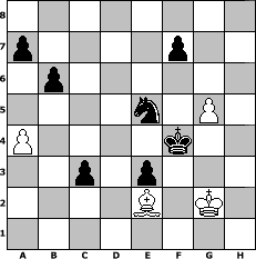 game notation in PGN-format [Event "8. Wikinger-Klubmeisterschaft"] [Site "www.myChess.de"] [Date "2012.08.01"] [Round "1"] [White "Master1"] [Black "ElisabethPeters"] [ECO "D00"] [WhitemyELO "1380"] [BlackmyELO "1728"] [Result "0-1"] [TimeControl "10/1728000"] [WhiteDays "20"] [BlackDays "20"] [MyChessNo "83073"] 1. d4 d5 2. e3 Nf6 3. Bd3 Nc6 4. Nd2 e5 5. e4 Nxd4 6. Ngf3 Bg4 7. O-O Bxf3 8. Nxf3 dxe4 9. Nxd4 Qxd4 10. Be2 Rd8 11. Be3 Qxb2 12. Qb1 Qxb1 13. Raxb1 b6 14. Bb5+ Ke7 15. Rbd1 h6 16. Rxd8 Kxd8 17. Bc6 Bb4 18. Rd1+ Ke7 19. h3 Rd8 20. Rxd8 Kxd8 21. g4 g5 22. Kh2 Ke7 23. f3 exf3 24. Bxf3 Ke6 25. c4 e4 26. Bd1 Bc5 27. Bc1 Ne8 28. h4 gxh4 29. Bxh6 Ke5 30. Kh3 Bf2 31. Bg5 e3 32. Bxh4 Bxh4 33. Kxh4 Kf4 34. Kh3 Nd6 35. Kg2 Nxc4 36. g5 Ne5 37. Be2 c5 38. a3 c4 39. a4 c3 0-1 position notation in FEN-format 8/p4p2/1p6/4n1P1/P4k2/2p1p3/4B1K1/8 - - - 0 40 Captured white pieces: ![]() ![]() ![]() ![]() ![]() ![]() ![]() ![]() ![]() ![]() ![]() ![]() ![]() ![]() ![]() Captured black pieces: ![]() ![]() ![]() ![]() ![]() ![]() ![]() ![]() ![]() ![]() ![]() ![]() ![]() ![]() ![]() Click on a captured piece in order to display the desired move!