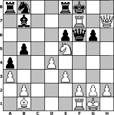 game notation in PGN-format [Event "Der Beste hinter den 1900ern(1/10) oder 10 hoch 2"] [Site "www.myChess.de"] [Date "2009.07.09"] [Round "1"] [White "RashimIbenRohal"] [Black "Knight"] [ECO "E20"] [WhitemyELO "1522"] [BlackmyELO "1168"] [Result "1-0"] [TimeControl "10/864000"] [WhiteDays "10"] [BlackDays "10"] [MyChessNo "57308"] 1. d4 Nf6 2. c4 e6 3. Nc3 Bb4 4. Bd2 d5 5. e3 O-O 6. Nf3 Nc6 7. Bd3 Re8 8. O-O dxc4 9. Bxc4 a6 10. a3 Bxc3 11. Bxc3 b5 12. Bb3 a5 13. Rc1 a4 14. Ba2 Bb7 15. Qc2 Nb8 16. Ne5 Nd5 17. Bb1 Nxc3 18. Qxh7+ Kf8 19. Rxc3 Qf6 20. Rxc7 g6 21. Rxf7+ 1-0 position notation in FEN-format rn2rk2/1b3R1Q/4pqp1/1p2N3/p2P4/P3P3/1P3PPP/1B3RK1 - - - 0 21 Captured white pieces: Captured black pieces: Click on a captured piece in order to display the desired move!