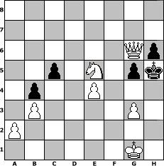 game notation in PGN-format [Event "April 2018"] [Site "www.myChess.de"] [Date "2018.04.11"] [Round "1"] [White "alibengali"] [Black "Achimkogge"] [ECO "D11"] [WhitemyELO "1720"] [BlackmyELO "1378"] [Result "1-0"] [TimeControl "10/1728000"] [WhiteDays "98"] [BlackDays "98"] [MyChessNo "111962"] 1. d4 d5 2. c4 c6 3. Nf3 dxc4 4. e3 Bg4 5. Bxc4 e6 6. O-O b5 7. Be2 Bd6 8. Nbd2 Nf6 9. b3 Qc7 10. Bb2 Nbd7 11. e4 Bf4 12. e5 Nd5 13. Ne4 O-O 14. h3 Bf5 15. Nd6 Bg6 16. Nh4 Qa5 17. Nxg6 fxg6 18. g3 Bg5 19. Ne4 Be3 20. fxe3 Rxf1+ 21. Qxf1 Rf8 22. Qc1 Qb6 23. Qd2 h6 24. Rf1 Nxe5 25. Rxf8+ Kxf8 26. dxe5 Kg8 27. Bd4 Qb7 28. Nd6 Qc7 29. Bg4 Qd8 30. Bxe6+ Kh7 31. e4 Nc7 32. Bf7 Qd7 33. Bxa7 Qxh3 34. Qh2 Qd7 35. Bc5 Ne6 36. Qh3 Nxc5 37. Qxd7 Nxd7 38. e6 Ne5 39. e7 Nxf7 40. Nxf7 g5 41. e8=Q c5 42. Qh8+ Kg6 43. Ne5+ Kh5 44. Qxg7 b4 45. Qg6# 1-0 position notation in FEN-format 8/8/6Qp/2p1N1pk/1p2P3/1P4P1/P7/6K1 - - - 1 45 Captured white pieces: ![]() ![]() ![]() ![]() ![]() ![]() ![]() ![]() ![]() ![]() ![]() ![]() ![]() ![]() ![]() Captured black pieces: ![]() ![]() ![]() ![]() ![]() ![]() ![]() ![]() ![]() ![]() ![]() ![]() ![]() ![]() ![]() Click on a captured piece in order to display the desired move!
