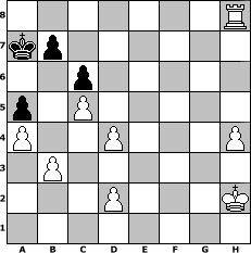 game notation in PGN-format [Event "Schach der Korona-Pandemie"] [Site "www.myChess.de"] [Date "2020.12.05"] [Round "1"] [White "lotchi"] [Black "wolni55"] [ECO "D02"] [WhitemyELO "1320"] [BlackmyELO "1380"] [Result "1-0"] [TimeControl "10/2592000"] [WhiteDays "150"] [BlackDays "141"] [MyChessNo "120081"] 1. d4 d5 2. Nf3 Bf5 3. Nc3 e6 4. Bf4 h5 5. h3 Nc6 6. a3 a6 7. Ne5 Nxe5 8. Bxe5 f6 9. Bh2 Bd6 10. e3 Qd7 11. Bd3 Bh7 12. Bxh7 Rxh7 13. O-O O-O-O 14. Bxd6 Qxd6 15. f4 Ne7 16. g3 Nf5 17. Qe1 Rg8 18. Rd1 g5 19. e4 gxf4 20. exf5 Rxg3+ 21. Kh2 exf5 22. Qe8+ Qd8 23. Qxd8+ Kxd8 24. Nxd5 Rhg7 25. Nxf4 h4 26. Ne6+ Kd7 27. Nxg7 Rxg7 28. Rxf5 c6 29. Rxf6 Re7 30. Rdf1 Re2+ 31. R1f2 Re4 32. R6f4 Re7 33. Rf7 Kd6 34. Rxe7 Kxe7 35. Rf4 Kd7 36. Rxh4 Kc7 37. c4 Kb6 38. b3 a5 39. a4 Ka6 40. Rh7 Kb6 41. c5+ Ka6 42. Rh8 Ka7 43. h4 1-0 position notation in FEN-format 7R/kp6/2p5/p1P5/P2P3P/1P6/3P3K/8 - - - 0 43 Captured white pieces: Captured black pieces: Click on a captured piece in order to display the desired move!