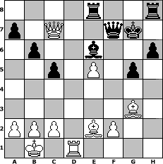 game notation in PGN-format [Event "martins Neujahrs - Fest - Open"] [Site "www.myChess.de"] [Date "2010.12.22"] [Round "1"] [White "woern63"] [Black "Lemmi11"] [ECO "C45"] [WhitemyELO "1797"] [BlackmyELO "1813"] [Result "0-1"] [TimeControl "10/1728000"] [WhiteDays "20"] [BlackDays "20"] [MyChessNo "70702"] 1. e4 e5 2. Nf3 Nc6 3. d4 exd4 4. Nxd4 Nf6 5. Nxc6 dxc6 6. Nd2 Bc5 7. Bd3 Ng4 8. Rf1 Nxh2 9. Qh5 Nxf1 10. Qxc5 Nxd2 11. Qe5+ Kf8 12. Bxd2 Qd6 13. Qh5 Be6 14. O-O-O b6 15. Kb1 f6 16. Qh4 c5 17. g4 h6 18. g5 fxg5 19. Bxg5 Bf7 20. Bf4 Qg6 21. Be2 Qg2 22. Bg3 Re8 23. e5 g5 24. Qg4 Be6 25. Qh5 Qh3 26. Qf3+ Qf5 27. Qb7 Kg7 28. Qxc7+ Qf7 0-1 position notation in FEN-format 4r2r/p1Q2qk1/1p2b2p/2p1P1p1/8/6B1/PPP1BP2/1K1R4 - - - 1 29 Captured white pieces: Captured black pieces: Click on a captured piece in order to display the desired move!