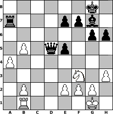 game notation in PGN-format [Event "2016"] [Site "www.myChess.de"] [Date "2016.01.01"] [Round "1"] [White "muetoe"] [Black "nyffhans"] [ECO "B52"] [WhitemyELO "1916"] [BlackmyELO "1939"] [Result "0-1"] [TimeControl "10/2592000"] [WhiteDays "29"] [BlackDays "26"] [MyChessNo "101950"] 1. e4 c5 2. Nf3 d6 3. Bb5+ Bd7 4. Bxd7+ Qxd7 5. O-O Nf6 6. d4 cxd4 7. Qxd4 g6 8. h3 Bg7 9. Nc3 Nc6 10. Qd3 Rc8 11. Rb1 b6 12. Rd1 Qb7 13. Bg5 h6 14. Bf4 O-O 15. Nd5 Nxd5 16. exd5 Ne5 17. Bxe5 dxe5 18. c4 b5 19. cxb5 Rfd8 20. Qe3 Rc7 21. a4 Rxd5 22. Rxd5 Qxd5 23. Qxa7 Rxa7 0-1 position notation in FEN-format 6k1/r3ppb1/6pp/1P1qp3/P7/5N1P/1P2PPP1/1R4K1 - - - 0 24 Captured white pieces: Captured black pieces: Click on a captured piece in order to display the desired move!