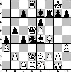 game notation in PGN-format [Event "In diesem Sommer gehts noch mal heiss her"] [Site "www.myChess.de"] [Date "2024.07.20"] [Round "1"] [White "deepsabel"] [Black "Ziegert"] [ECO "D24"] [WhitemyELO "1779"] [BlackmyELO "2042"] [Result "0-1"] [TimeControl "10/2592000"] [WhiteDays "83"] [BlackDays "38"] [MyChessNo "132115"] 1. d4 d5 2. c4 dxc4 3. Nf3 Nf6 4. Nc3 a6 5. e4 b5 6. e5 Nd5 7. Be2 Nc6 8. Nxd5 Qxd5 9. Be3 Bf5 10. O-O e6 11. Rc1 Bb4 12. a3 Be7 13. Qd2 O-O 14. Rfd1 Rad8 15. Qc3 a5 16. h3 a4 17. Kh1 Be4 18. Kg1 f5 19. Qd2 Rf7 20. Ne1 f4 21. Bxf4 Nxd4 0-1 position notation in FEN-format 3r2k1/2p1brpp/4p3/1p1qP3/p1pnbB2/P6P/1P1QBPP1/2RRN1K1 - - - 0 22 Captured white pieces: Captured black pieces: Click on a captured piece in order to display the desired move!
