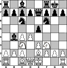 game notation in PGN-format [Event "Zum Sommeranfang"] [Site "www.myChess.de"] [Date "2017.06.11"] [Round "1"] [White "noma"] [Black "espero"] [ECO "A22"] [WhitemyELO "1819"] [BlackmyELO "1904"] [Result "0-1"] [TimeControl "10/2592000"] [WhiteDays "00"] [BlackDays "20"] [MyChessNo "108517"] 1. c4 e5 2. Nc3 Nf6 3. Nf3 Nc6 4. e3 Bb4 5. d4 Qe7 6. Be2 O-O 0-1 position notation in FEN-format r1b2rk1/ppppqppp/2n2n2/4p3/1bPP4/2N1PN2/PPP1BPPP/R1BQK2R - KQ - 3 7 Captured white pieces: Captured black pieces: Click on a captured piece in order to display the desired move!