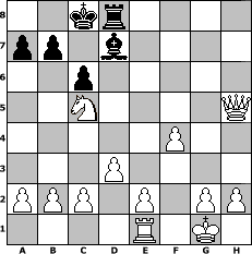 game notation in PGN-format [Event "Pfingst -Turnier"] [Site "www.myChess.de"] [Date "2009.05.30"] [Round "2"] [White "alpacino"] [Black "Caligula"] [ECO "C42"] [WhitemyELO "1325"] [BlackmyELO "1264"] [Result "1-0"] [TimeControl "10/2592000"] [WhiteDays "83"] [BlackDays "90"] [MyChessNo "56173"] 1. e4 e5 2. Nf3 Nf6 3. Bd3 Nc6 4. O-O d5 5. Re1 dxe4 6. Bxe4 Nxe4 7. Rxe4 f5 8. Rxe5+ Nxe5 9. Nxe5 Bd6 10. Qh5+ g6 11. Nxg6 Rg8 12. Ne5+ Rg6 13. Nxg6 hxg6 14. Qxg6+ Kf8 15. d3 f4 16. Nc3 Qe7 17. Qh6+ Ke8 18. Qh8+ Kd7 19. Qh3+ Kc6 20. Qf3+ Kd7 21. Bxf4 c6 22. Bxd6 Qxd6 23. Qf5+ Kc7 24. Qf7+ Bd7 25. Ne4 Qh6 26. Nc5 Rd8 27. Re1 Kc8 28. f4 Qh5 29. Qxh5 1-0 position notation in FEN-format 2kr4/pp1b4/2p5/2N4Q/5P2/3P4/PPP1P1PP/4R1K1 - - - 0 29 Captured white pieces: ![]() ![]() ![]() ![]() ![]() ![]() ![]() ![]() ![]() ![]() ![]() ![]() ![]() ![]() ![]() Captured black pieces: ![]() ![]() ![]() ![]() ![]() ![]() ![]() ![]() ![]() ![]() ![]() ![]() ![]() ![]() ![]() Click on a captured piece in order to display the desired move!
