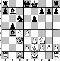 game notation in PGN-format [Event "M"] [Site "www.myChess.de"] [Date "2013.09.19"] [Round "1"] [White "Naunhofer"] [Black "kalle"] [ECO "D10"] [WhitemyELO "1664"] [BlackmyELO "1603"] [Result "0-1"] [TimeControl "10/3456000"] [WhiteDays "40"] [BlackDays "39"] [MyChessNo "90348"] 1. d4 d5 2. c4 c6 3. Nc3 Nf6 4. Nf3 dxc4 5. e3 b5 6. a4 Nd5 7. Qc2 Nxc3 8. Qxc3 Bb7 9. axb5 cxb5 10. Be2 e6 11. b3 Nc6 12. bxc4 Bb4 0-1 position notation in FEN-format r2qk2r/pb3ppp/2n1p3/1p6/1bPP4/2Q1PN2/3PBPPP/R1B1K2R - KQkq - 1 13 Captured white pieces: Captured black pieces: Click on a captured piece in order to display the desired move!