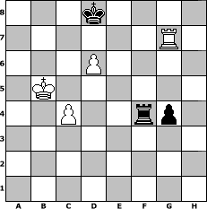 game notation in PGN-format [Event "Schachturnier Vier"] [Site "www.myChess.de"] [Date "2016.04.26"] [Round "1"] [White "sprinterde"] [Black "FrankB"] [ECO "A13"] [WhitemyELO "1761"] [BlackmyELO "1623"] [Result "1-0"] [TimeControl "10/1728000"] [WhiteDays "20"] [BlackDays "20"] [MyChessNo "103441"] 1. c4 e6 2. d4 b6 3. Nc3 Bb7 4. e4 Bb4 5. Bd3 Ne7 6. Nge2 c5 7. d5 e5 8. Bg5 d6 9. O-O Bxc3 10. bxc3 O-O 11. Ng3 Bc8 12. a4 f6 13. Be3 f5 14. exf5 Nxf5 15. Nxf5 Bxf5 16. Bxf5 Rxf5 17. f4 Nd7 18. Qg4 Rf8 19. Qe6+ Kh8 20. fxe5 Nxe5 21. Rf4 Qd7 22. Qxd7 Nxd7 23. Rxf8+ Rxf8 24. Bg5 Re8 25. Bf4 Ne5 26. Bxe5 Rxe5 27. a5 bxa5 28. Rxa5 Re7 29. Ra6 Rd7 30. Kf2 Kg8 31. Ke3 Kf7 32. Kf4 Kf6 33. g4 g5+ 34. Ke3 Ke5 35. Ra1 Rf7 36. Re1 Kf6 37. Ra1 Re7+ 38. Kd3 Kf7 39. Ra6 Rd7 40. h3 Kg6 41. Rc6 h5 42. Rc8 hxg4 43. hxg4 Kf6 44. Re8 Kf7 45. Re6 Rd8 46. Kc2 Rd7 47. Kb3 Rb7+ 48. Ka4 Rb6 49. Ka5 Rb3 50. Rxd6 Rxc3 51. Kb5 Rg3 52. Ra6 Rxg4 53. Rxa7+ Ke8 54. Kxc5 Rf4 55. Ra2 Rf6 56. d6 Rf4 57. Re2+ Kd7 58. Re7+ Kd8 59. Rg7 g4 60. Kb5 1-0 position notation in FEN-format 3k4/6R1/3P4/1K6/2P2rp1/8/8/8 - - - 1 60 Captured white pieces: Captured black pieces: Click on a captured piece in order to display the desired move!