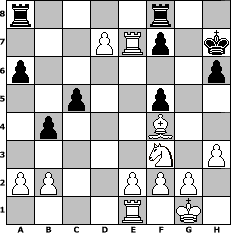 game notation in PGN-format [Event "Osterei 2015"] [Site "www.myChess.de"] [Date "2015.04.05"] [Round "1"] [White "alibengali"] [Black "hape50"] [ECO "B00"] [WhitemyELO "1671"] [BlackmyELO "1330"] [Result "1-0"] [TimeControl "10/2592000"] [WhiteDays "73"] [BlackDays "89"] [MyChessNo "98806"] 1. e4 a6 2. d4 e6 3. Nf3 h6 4. c4 Nf6 5. Nc3 Bb4 6. Qc2 c5 7. d5 Bxc3+ 8. Qxc3 O-O 9. Bd3 exd5 10. cxd5 d6 11. O-O Nbd7 12. Re1 b5 13. Bf4 Nb6 14. h3 b4 15. Qd2 Nh7 16. e5 Nxd5 17. Bxh7+ Kxh7 18. Qxd5 Bf5 19. exd6 Rc8 20. Qxf5+ g6 21. Qd5 Qd7 22. Re7 Qf5 23. Qxf5 gxf5 24. d7 Ra8 25. Re1 1-0 position notation in FEN-format r4r2/3PRp1k/p6p/2p2p2/1p3B2/5N1P/PP2PPP1/4R1K1 - - - 2 25 Captured white pieces: Captured black pieces: Click on a captured piece in order to display the desired move!