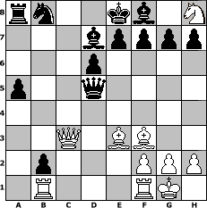 game notation in PGN-format [Event "Alt Benoni"] [Site "www.myChess.de"] [Date "2017.09.25"] [Round "2"] [White "Erich"] [Black "alibengali"] [ECO "A43"] [WhitemyELO "2150"] [BlackmyELO "1676"] [Result "1-0"] [TimeControl "10/2592000"] [WhiteDays "90"] [BlackDays "87"] [MyChessNo "109700"] 1. d4 c5 2. d5 Nf6 3. Nf3 c4 4. Nc3 Qa5 5. e4 Nxe4 6. Bd2 Nd6 7. Ne5 Qc7 8. Bf4 b5 9. a4 b4 10. Nb5 Nxb5 11. axb5 c3 12. Ng6 d6 13. b6 Qxb6 14. Be3 Qc7 15. Nxh8 cxb2 16. Rb1 Qc3+ 17. Qd2 Qa3 18. Bb5+ Bd7 19. Be2 Qa2 20. O-O a5 21. c3 bxc3 22. Qxc3 Qxd5 23. Bf3 1-0 position notation in FEN-format rn2kb1N/3bpppp/3p4/p2q4/8/2Q1BB2/1p3PPP/1R3RK1 - kq - 1 23 Captured white pieces: Captured black pieces: Click on a captured piece in order to display the desired move!