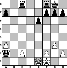 | game notation in PGN-format [Event "5 Jahre Wikinger"] [Site "www.myChess.de"] [Date "2009.12.13"] [Round "1"] [White "gunni50"] [Black "Helmut48"] [ECO "C16"] [WhitemyELO "1294"] [BlackmyELO "1812"] [Result "0-1"] [TimeControl "10/864000"] [WhiteDays "10"] [BlackDays "10"] [MyChessNo "61533"] 1. e4 e6 2. d4 d5 3. Nc3 Bb4 4. e5 Ne7 5. Bd2 b6 6. Nf3 c5 7. dxc5 bxc5 8. Bd3 Nbc6 9. O-O c4 10. Be2 O-O 11. a3 Ba5 12. b3 d4 13. Ne4 d3 14. bxc4 dxe2 15. Qxe2 Ng6 16. Bxa5 Qxa5 17. Qe3 Ba6 18. c5 Bxf1 19. Kxf1 Ngxe5 20. Nd6 Ng4 21. Qf4 Qxc5 22. Qxg4 Qxd6 23. g3 Ne5 24. Qe4 Nxf3 25. Qxf3 Rac8 26. Ra2 Qb6 27. Qe2 Qb1+ 28. Qe1 Qxa2 0-1 position notation in FEN-format 2r2rk1/p4ppp/4p3/8/8/P5P1/q1P2P1P/4QK2 - - - 0 29 Captured white pieces:                              Captured black pieces:                               Click on a captured piece in order to display the desired move!