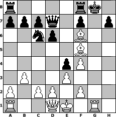 game notation in PGN-format [Event "unter uns 59 (IAdvent, Advent...)"] [Site "www.myChess.de"] [Date "2025.12.04"] [Round "1"] [White "faustballer"] [Black "Haneken"] [ECO "A01"] [WhitemyELO "1464"] [BlackmyELO "1141"] [Result "1-0"] [TimeControl "10/864000"] [WhiteDays "30"] [BlackDays "11"] [MyChessNo "134024"] 1. b3 Nf6 2. e3 e5 3. Bb2 d6 4. h3 Be7 5. Nc3 O-O 6. Nf3 Bf5 7. Be2 e4 8. Nh4 Be6 9. g3 Qd7 10. Ng2 Bxh3 11. Nf4 Bf5 12. Nh5 Bh3 13. Nf4 Bf5 14. Rg1 Nc6 15. Ncd5 g5 16. Nxf6+ Bxf6 17. Bxf6 gxf4 18. gxf4+ Bg6 19. Bg4 Bf5 20. Bxf5# 1-0 position notation in FEN-format r4rk1/pppq1p1p/2np1B2/5B2/4pP2/1P2P3/P1PP1P2/R2QK1R1 - Q - 0 20 Captured white pieces: Captured black pieces: Click on a captured piece in order to display the desired move!