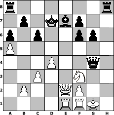 game notation in PGN-format [Event "Pfingsten 2020"] [Site "www.myChess.de"] [Date "2020.06.03"] [Round "2"] [White "lotchi"] [Black "alpacino"] [ECO "A46"] [WhitemyELO "1242"] [BlackmyELO "1244"] [Result "0-1"] [TimeControl "10/2592000"] [WhiteDays "86"] [BlackDays "61"] [MyChessNo "118544"] 1. d4 Nf6 2. Nf3 d6 3. Nc3 a6 4. Bg5 h6 5. Bxf6 exf6 6. e3 c6 7. Bd3 Be7 8. O-O Be6 9. a4 Nd7 10. Qd2 Nb6 11. h3 Qc8 12. Qe1 d5 13. a5 Nd7 14. e4 dxe4 15. Bxe4 Qc7 16. g4 Bc4 17. Ne2 Bxe2 18. Qxe2 h5 19. c3 hxg4 20. hxg4 Qf4 21. Bf5 g6 22. Bxd7+ Kxd7 23. Rae1 Qxg4# 0-1 position notation in FEN-format r6r/1p1kbp2/p1p2pp1/P7/3P2q1/2P2N2/1P2QP2/4RRK1 - - - 0 24 Captured white pieces: Captured black pieces: Click on a captured piece in order to display the desired move!